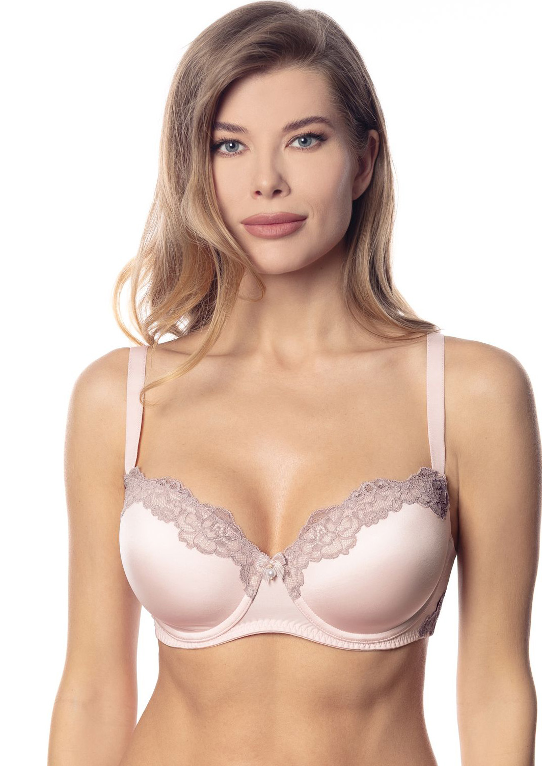 Бюстгальтер-балконет формованная чашка с высоким станом идеально подходит для дам с роскошными формами. Модель выполнена из эластичной микрофибры с сатиновым эффектом, декорирована кружевной лентой и жемчужной бусиной с бантом по центру. Анатомический дублированный пояс имеет дополнительные боковые каркасы. Застежка на два крючка.