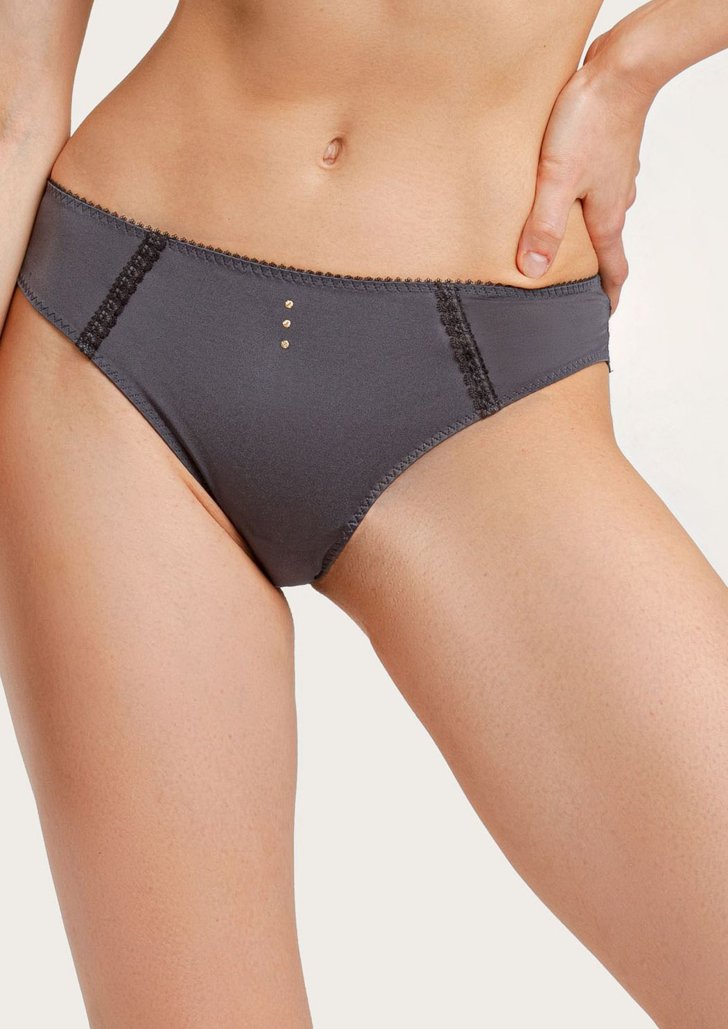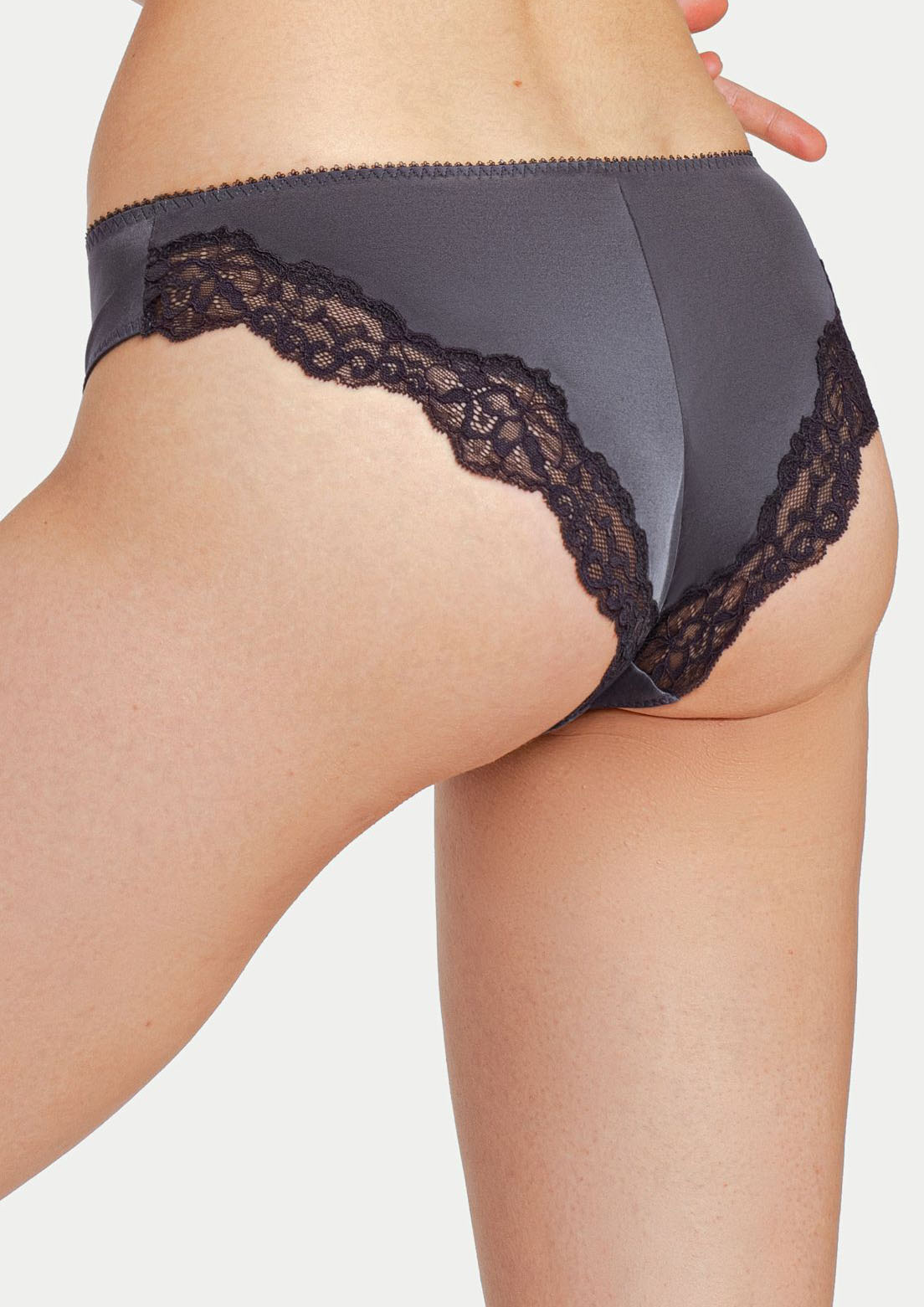 Трусы «бразилиана»со средней линией талии визуально округляет ягодицы. Выполнены из эластичной микрофибры с сатиновым эффектом, декорированы кружевной лентой. Передняя деталь украшена кристаллами.
