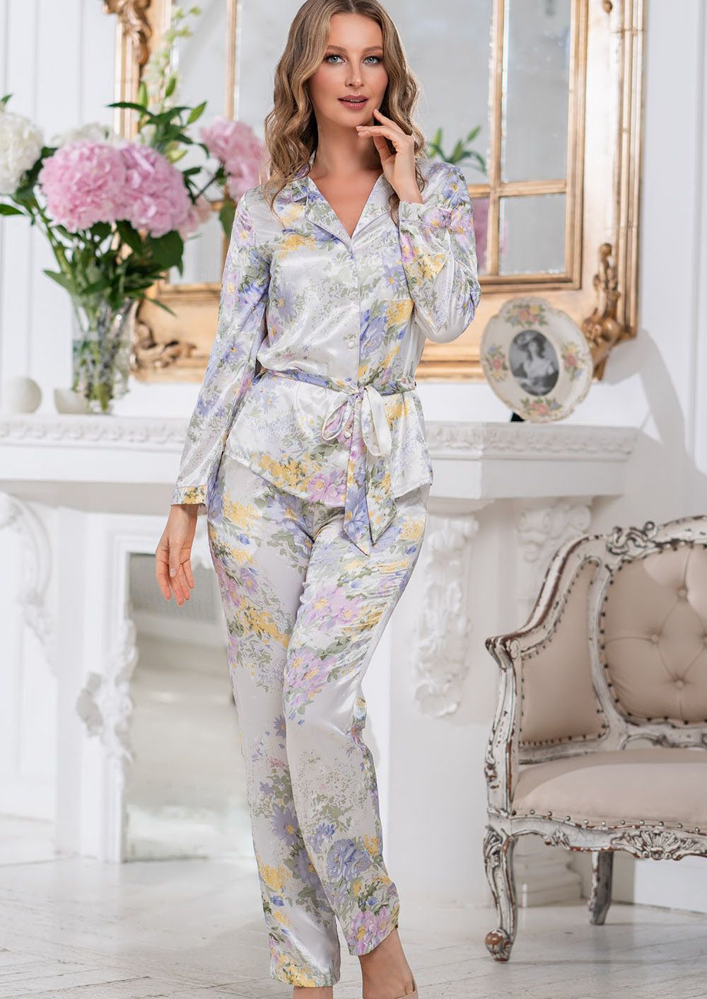 Комплект выполнен из смесовой шелковой принтованной ткани в нежных пастельных оттенках. Комплект состоит из топа на тонких бретелях, брюк и жакета с длинными рукавами и центральной застежкой на пуговицы. Верхний край топа оформлен кружевом, жакет по рукавам, борту и кармашек на груди украшен лиловым кантиком.