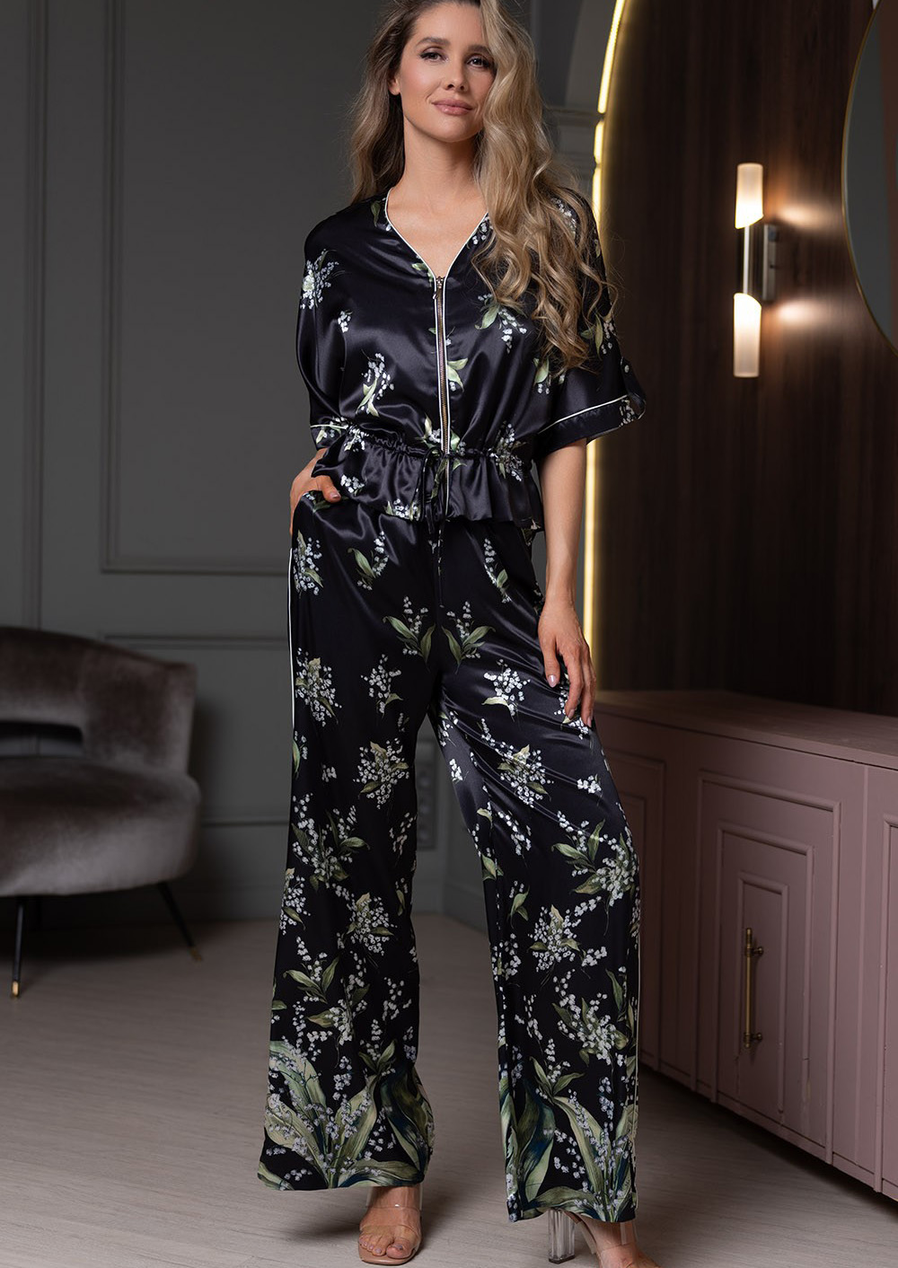 Комплект состоит из лёгкого бомбера с центральной застёжкой на молнию и брюк свободного силуэта с эластичным поясом. Комплект выполнен из принтованного смесового шёлка. Горловина имеет V -Образный вырез, по низу бомбера декоративная баска с кулиской по талии, горловина и рукава жакета, брюки декорированы контрастным кантом. В боковых швах брюк есть карманы.