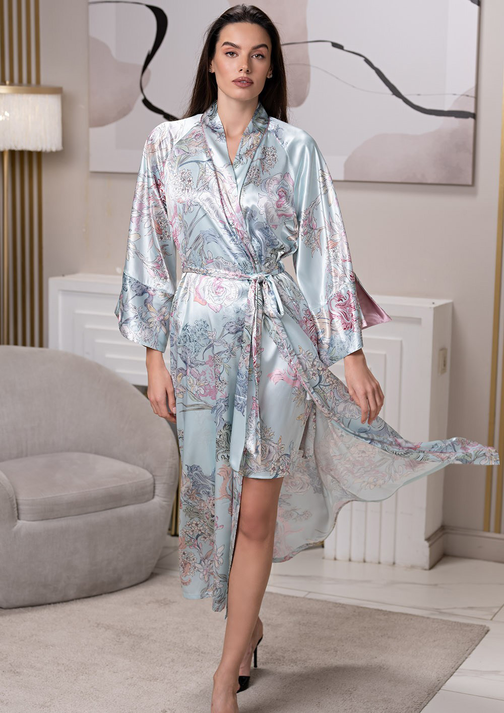 Длинный запашной халат с широким длинным рукавом. Халат выполнен из принтованного смесового шелка. По бокам расположены карманы.